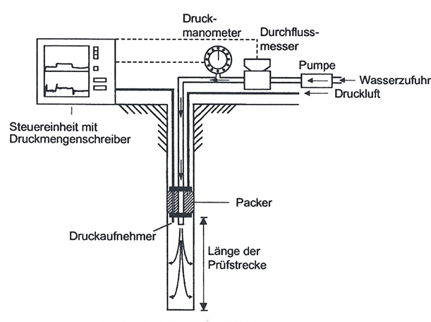 If cavities within the grout connection are suspected, for example due to cracks in the drill cores or water leaks from the grout connection, then the water pressure test is a suitable method for determining the permeability of the concrete structure. To do this, the steel of the pin and the grout material are drilled through in several places and sealed with packers. These are then pressurized one after the other with water at a defined pressure. The amount of water absorbed per unit of time is recorded based on the injection pressure.